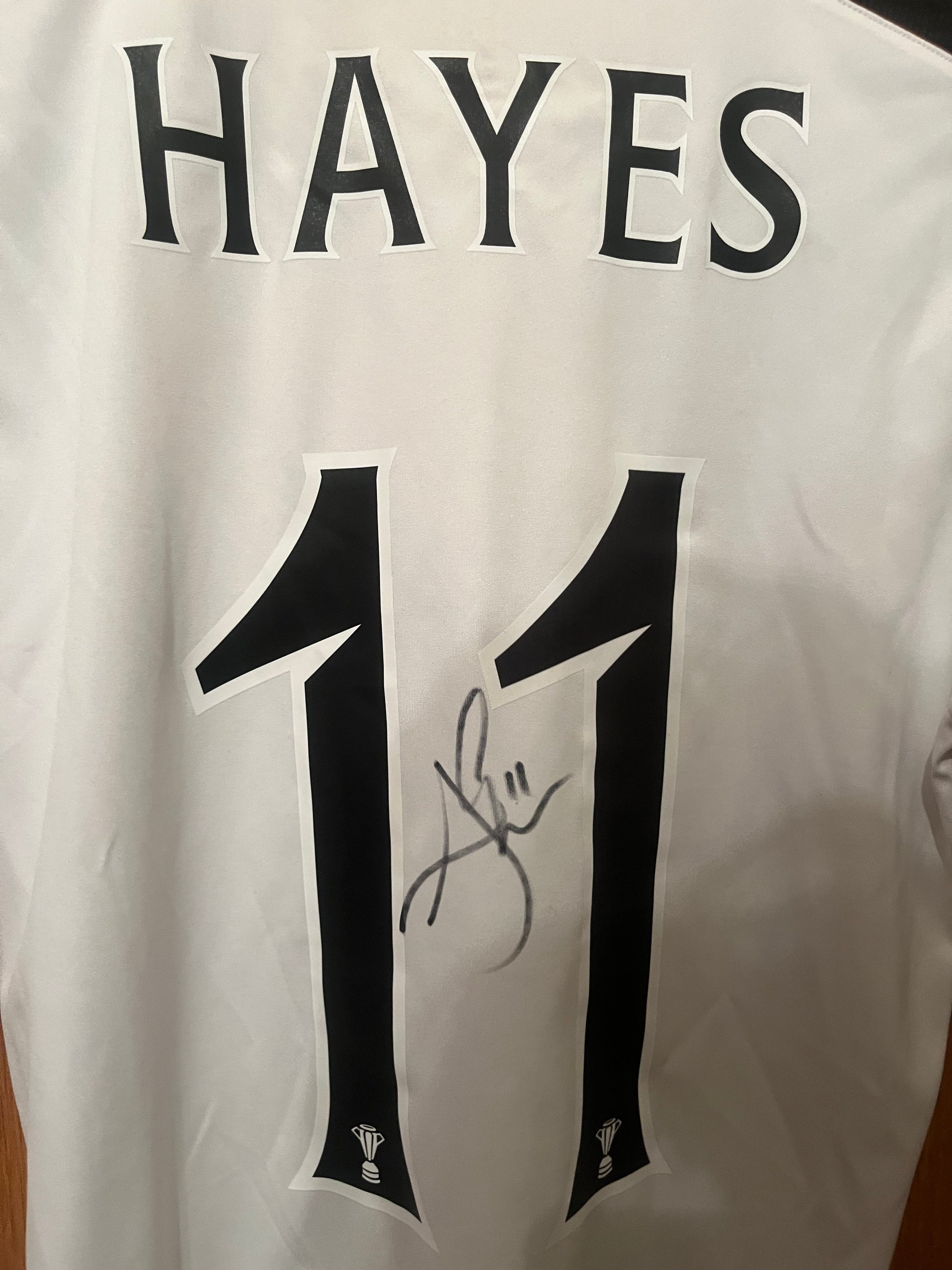 Very good condition, this signature has been personally obtained by us. We got the shirt, nameset applied, then reached out to Mr Hayes who was kindly open to working with us on a small collaboration project. Shirt is authentic, the signature of course is too